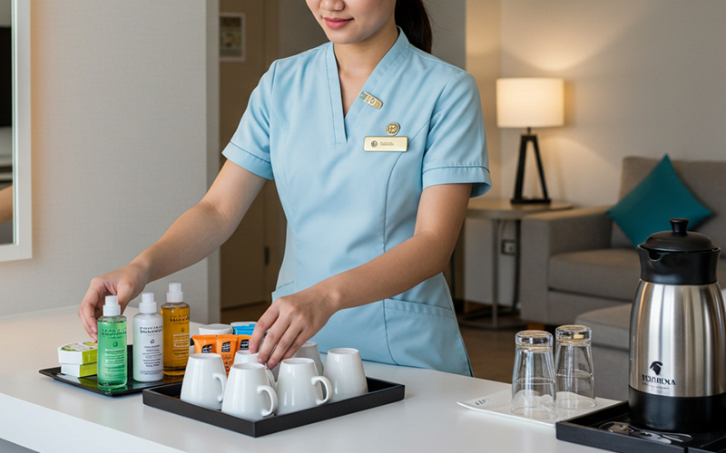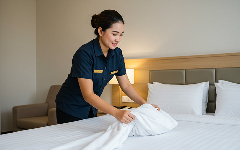 住み込みスタッフの配置が可能ですので、人材確保にお悩みのホテル様の清掃業務を、